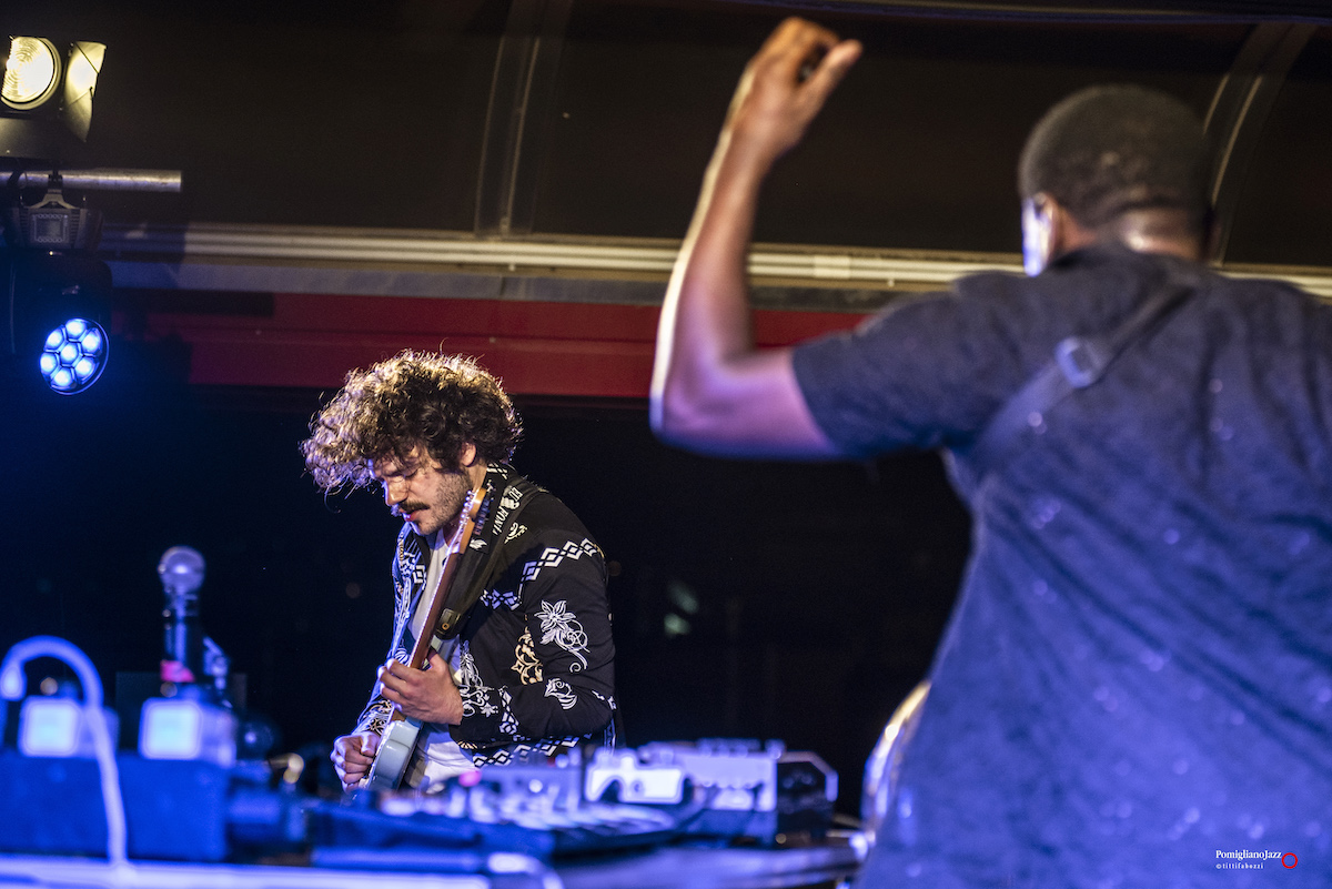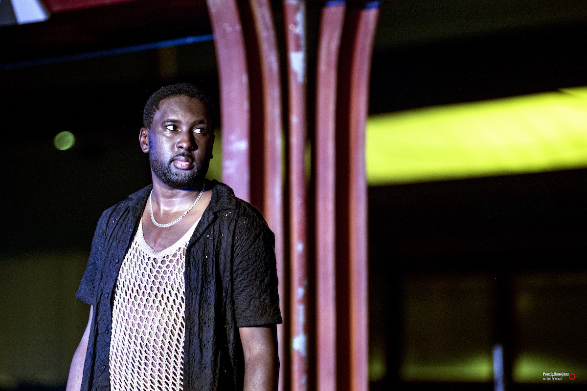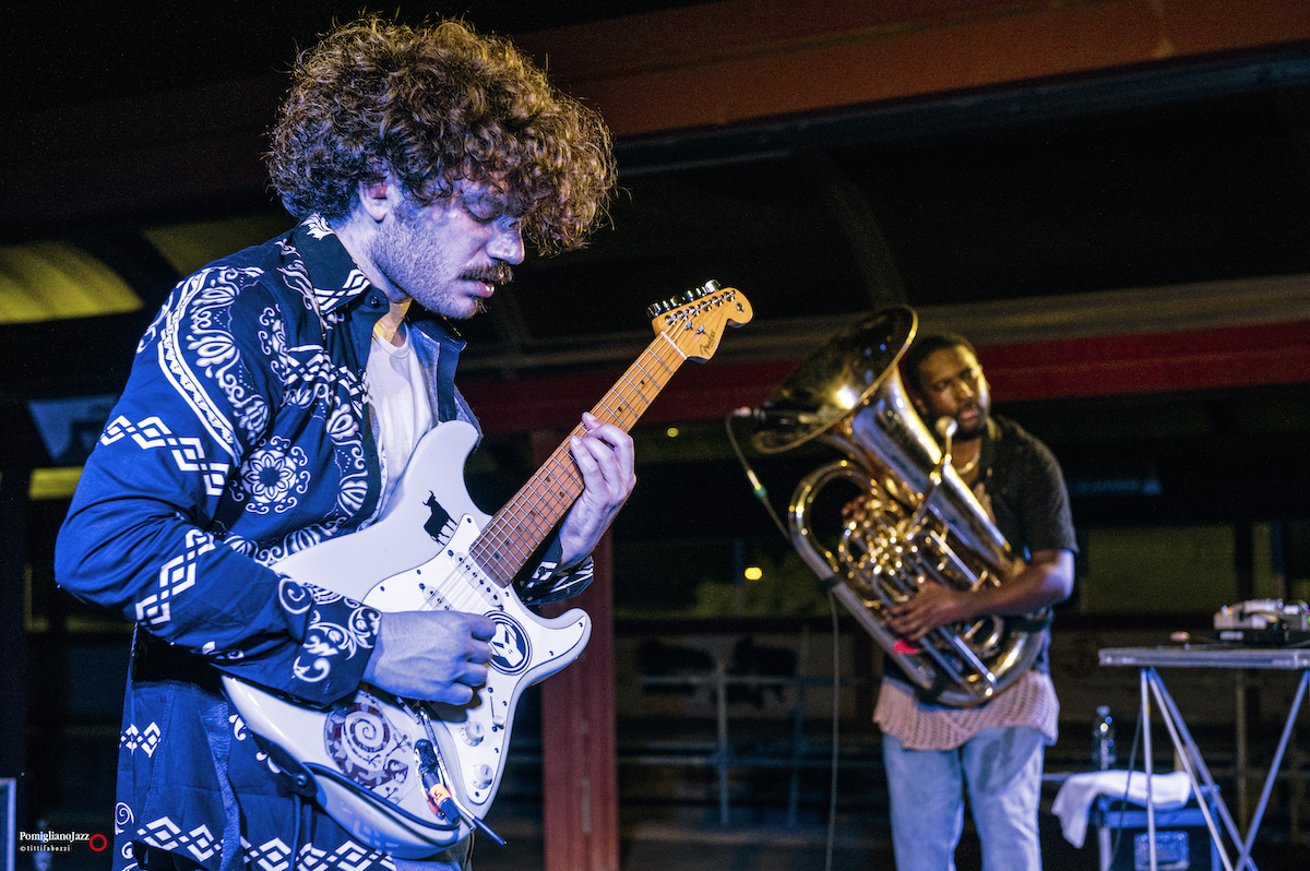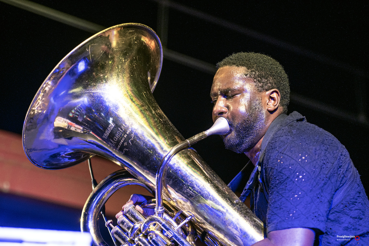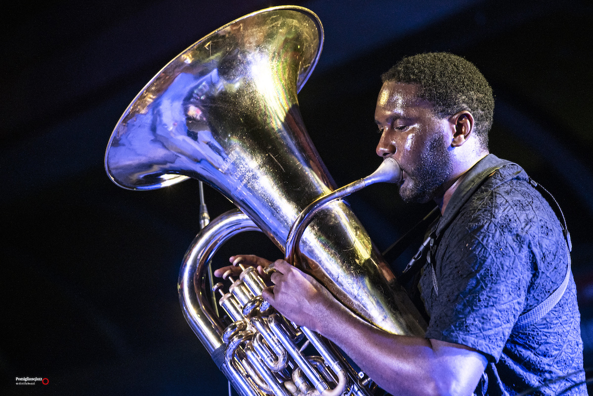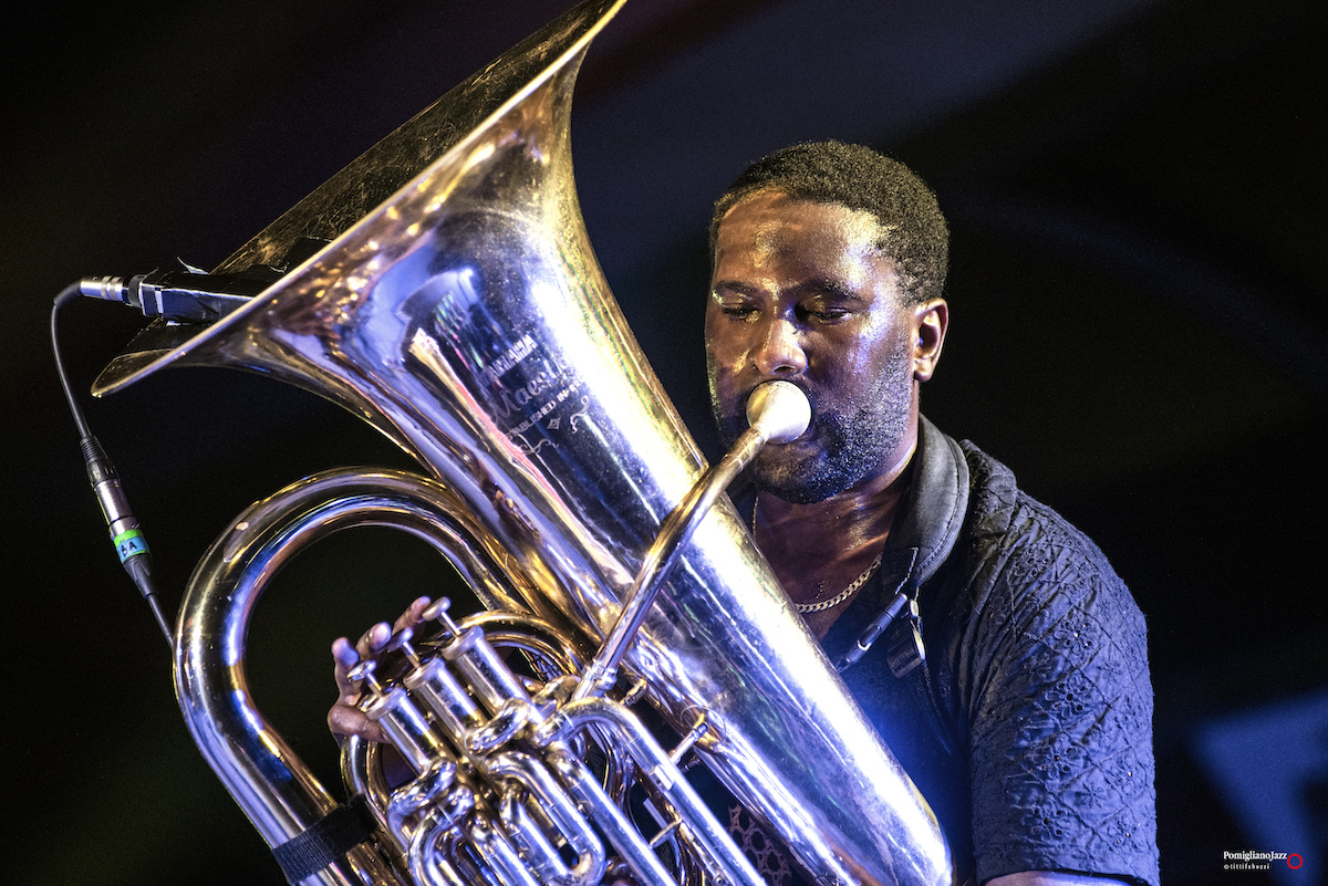 Chiude La prima giornata del Pomigliano Jazz alla stazione della Circumvesuviana di Pomigliano d’Arco Theon Cross, accompagnato sul palco da Nikos Zarkias alla chitarra e al basso elettrico.